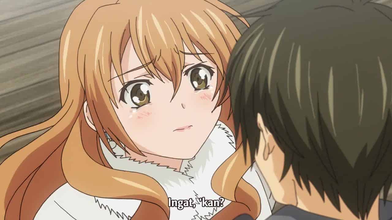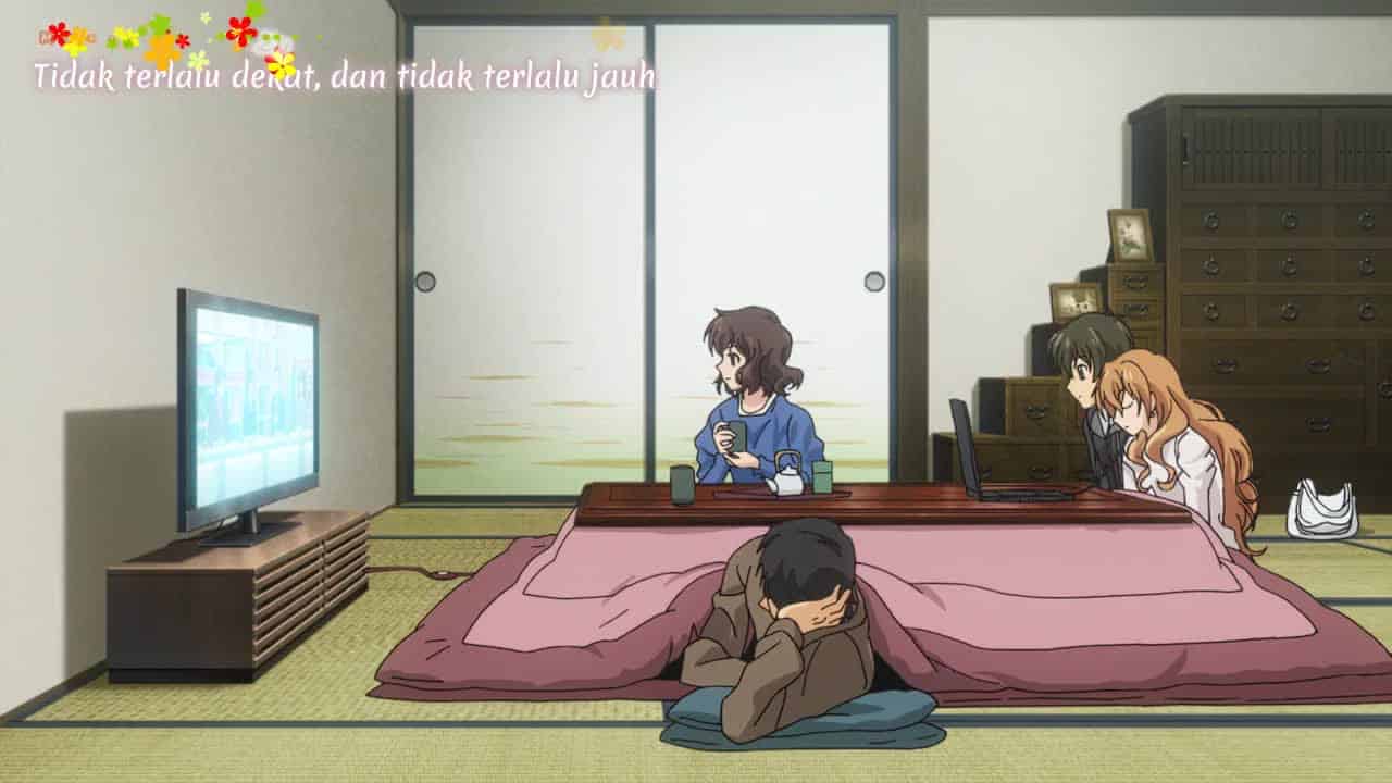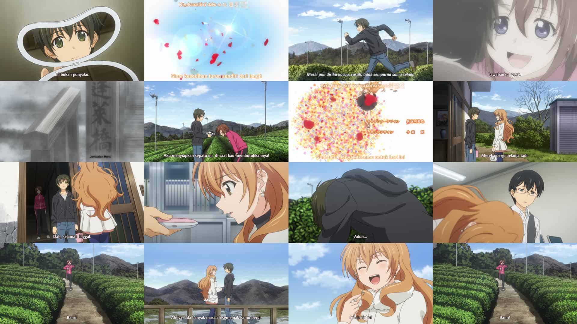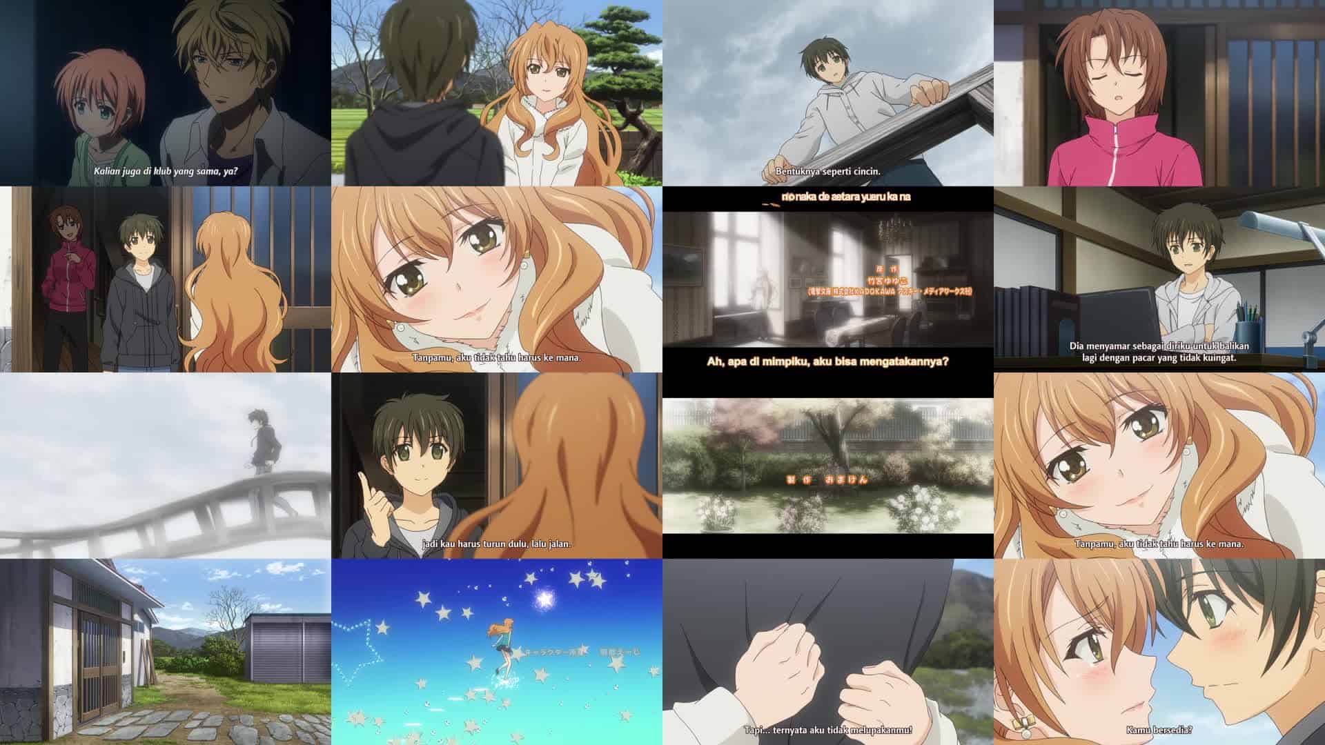 Nonton Anime Golden Time Episode 24 Subtitle Indonesia Gratis Full Movie yang menceritakan tentang Setelah kehilangan ingatannya baru-baru ini, Banri kembali ke kampung halamannya. Setelah mengutak-atik catatan yang dia buat sendiri sebelum ingatan lamanya kembali, Banri membuka akun email-nya dan menemukan bahwa seseorang telah mengirim email ke Kōko dengan namanya. Linda dan Banri tampaknya telah kembali ke persahabatan mereka yang mudah, dengan Linda menghabiskan Natal bersama keluarga Tada. Dia merenungkan balasan Linda atas perasaannya dan kejadian-kejadian yang terjadi di antara mereka sejak kecelakaannya. Kōko tiba di rumah Banri. Banri pertama-tama mengira dia adalah Chinami. Kōko menyerahkan Banri sebuah DVD dan kotak cerminnya yang retak, yang dilihat Banri sebagai milik Kōko dan mengembalikannya padanya. Setelah menanyakan arah ke jembatan tempat Banri jatuh, Kōko pergi dan Banri akhirnya mengingat Kōko setelah menemukan kotak cerminnya di samping catatan-catatannya. Akibatnya, Banri mengejar Kōko ke jembatan tempat dia bertemu dengan dirinya yang dulu yang berkonflik. Yang terakhir kemudian menyeberangi jembatan setelah Linda muncul dan memberikan balasannya atas perasaannya dengan “Ya” dan menyerahkan cincin yang dijatuhkannya di jembatan beberapa hari sebelumnya kepada Banri. Setelah itu, Banri memeluk Kōko dan keduanya mengingat janji mereka: bahwa selama mereka saling mengingat, keduanya akan tetap bersama selama sisa hidup mereka. Mereka menyatakan cinta mereka satu sama lain dan Banri memberikan cincinnya kepada Kōko, yang diterimanya dengan senang hati. Sementara itu, terungkap bahwa Nijigen bertanggung jawab atas pengiriman email spam sebagai Banri dan memotivasi Kōko untuk mengejarnya. Memanfaatkan motivasi Kōko, Chinami mengedit rekaman yang dibuat Banri tentang dirinya sendiri dan membakarnya ke DVD, yang dimintanya untuk diserahkan kepada Kōko kepada Banri. Sambil menonton rekamannya, Banri berterima kasih kepada Kōko karena telah berada di sisinya. Banri kemudian kembali ke Tokyo dan kuliah bersama teman-temannya. Hubungannya dengan Kōko masih utuh. Mitsuo dan Linda terlihat saling menggoda sementara Kōko dan Banri berciuman dengan Kōko yang mengenakan cincin pemberian Banri.