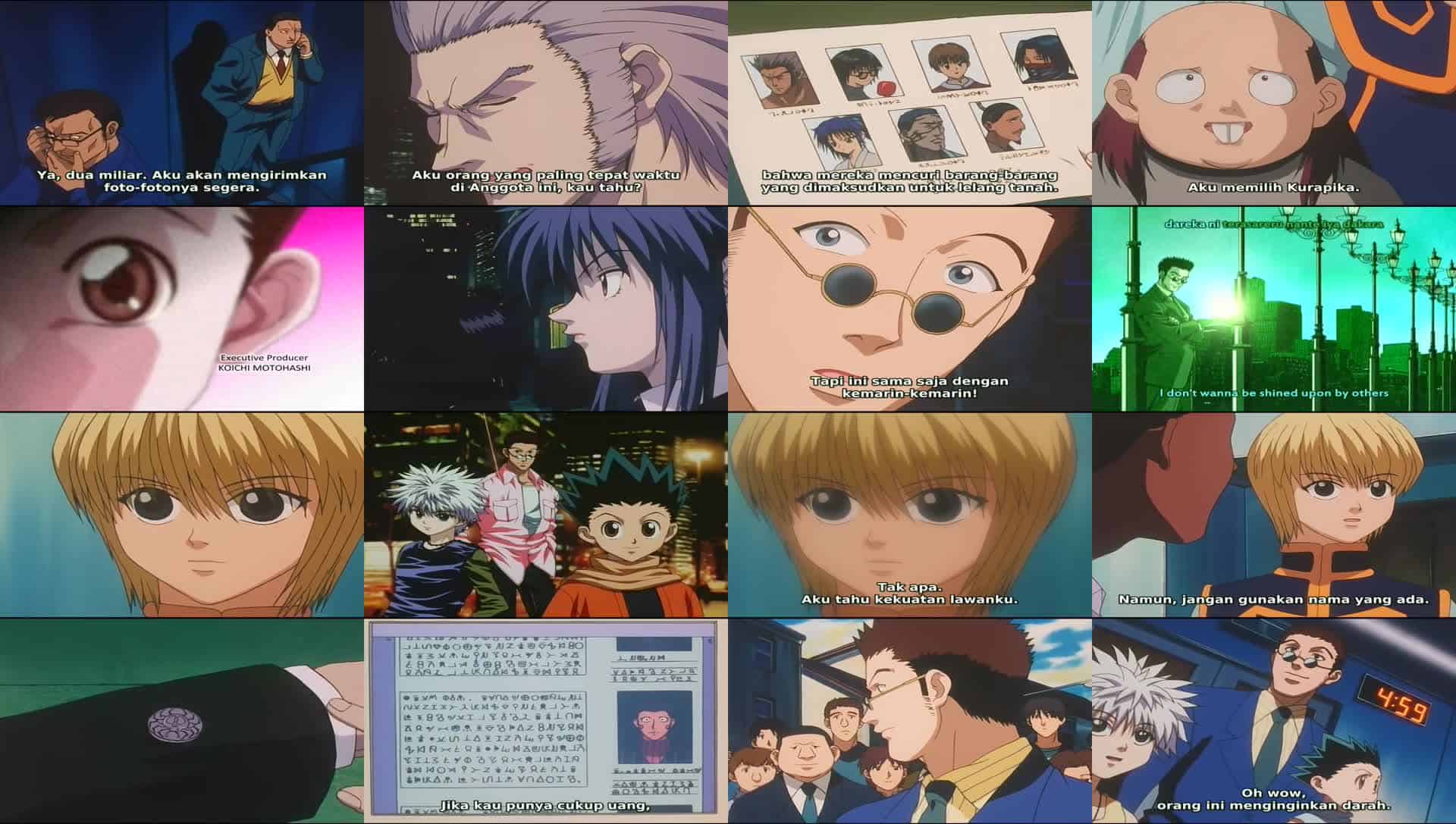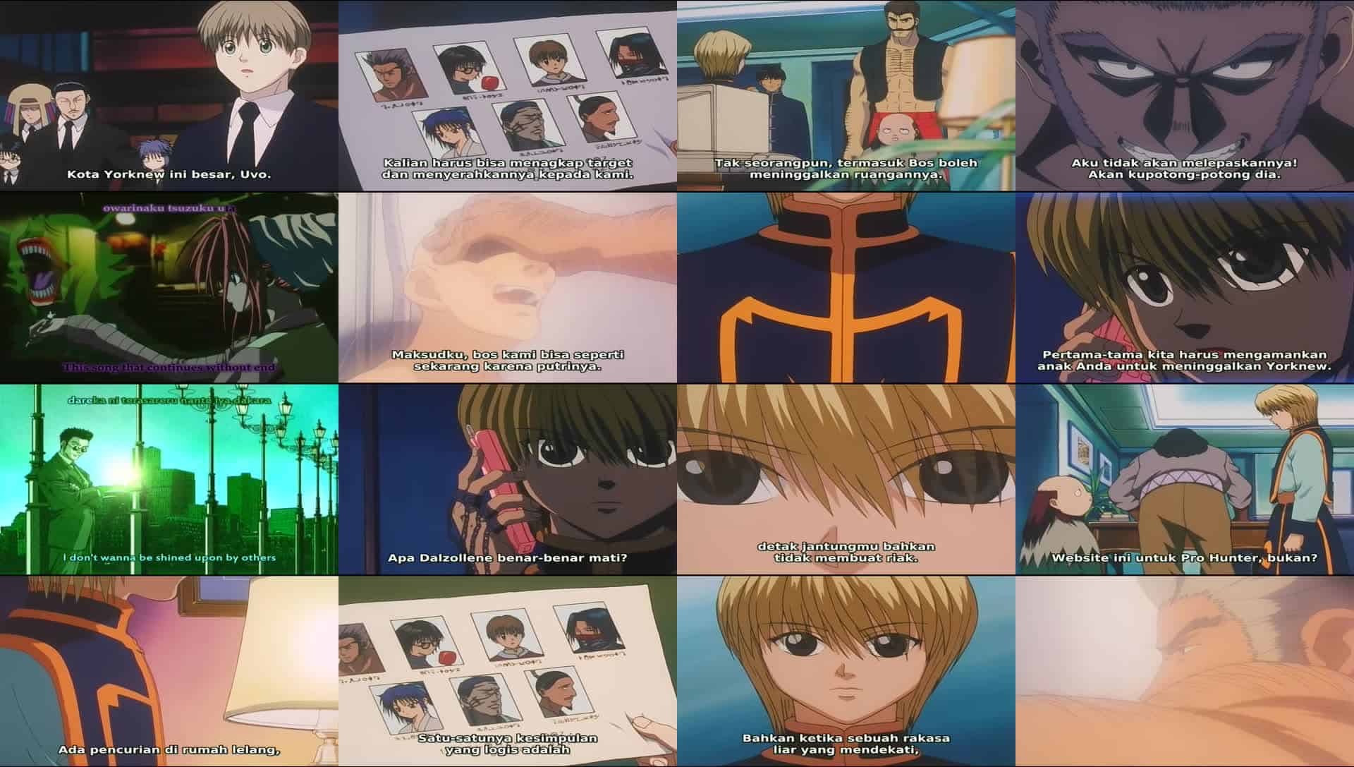 Nonton Anime Hunter x Hunter Episode 55 Subtitle Indonesia Gratis Full Movie yang menceritakan tentang Kurapika menghubungi bosnya (ayah Neon) dan diberi tahu bahwa ia akan bertanggung jawab setelah kematian Dalzollene. Uvogin yang mengamuk mencari “si pria rantai”, dan menemukannya sendirian bersama Neon dan yang lainnya yang telah dipindahkan ke ruangan lain. Mereka memutuskan untuk pergi ke luar kota agar bisa bertarung dengan kekuatan penuh. Leorio menyadari bahwa kekuatan Gon begitu populer dalam kontes panco sehingga mereka diundang ke lelang bawah tanah di mana setiap orang akan mendapatkan gambar-gambar Phantom Troupe dengan hadiah 2 miliar jenny untuk setiap kepala.