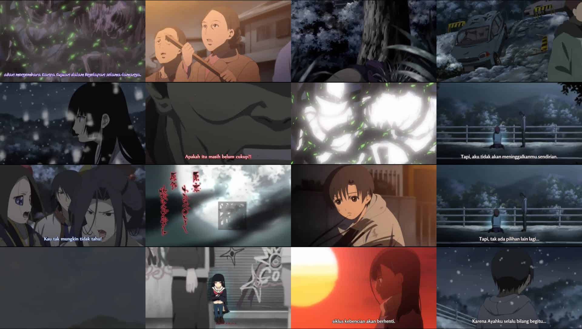 Nonton Anime Jigoku Shoujo Futakomori Episode 26 Subtitle Indonesia Gratis Full Movie yang menceritakan tentang Setelah kematian saudara laki-lakinya, Hotaru yang dirundung duka mengirim Takuma ke Neraka, berjanji untuk mengikutinya agar ia tidak sendirian. Ia bersikeras kepada Ai bahwa semuanya akan berakhir saat Takuma meninggal. Ai mulai mengantar Takuma ke Neraka, tetapi berhenti ketika Takuma memintanya untuk membawanya kembali. Mereka berdua kembali ke dunia fana, dengan Ai kembali ke wujud manusianya. Ia tidak memiliki ingatan tentang masa-masanya sebagai Gadis Neraka dan sama sekali tidak mengingat asistennya. Kikuri mengungkapkan dirinya sebagai tubuh inang bagi Penguasa Neraka, yang menghukum Ai karena gagal melakukan tugasnya. Ai sekarang fana. Takuma menemukan tubuh Hotaru terdampar di tepi danau, memberi tahu Ai bahwa ia tidak lagi memiliki kesabaran, dan berlari ke rumahnya untuk membakarnya. Ia dihadang oleh massa saat melakukannya dan hampir terbunuh sampai Ai turun tangan, menenangkan massa dan membawa Takuma menjauh dari rumah yang terbakar. Pria yang mengirim saudara laki-laki Hotaru ke Neraka marah dan mulai memukuli kepala Ai agar ia tidak masuk Neraka. Massa lainnya ikut bergabung. Para asisten Ai tidak dapat mencegah kematiannya, tetapi melihat Ai tersenyum tenang kepada mereka. Takuma memberi tahu massa untuk berhenti menyakiti Ai dan Ai pun meninggal sambil memegang tangan Takuma sambil berkata, “Sudah berakhir.” Tubuhnya berubah menjadi kelopak bunga sakura dan melayang pergi. Penguasa Neraka melepaskan jiwa orang tuanya (kemungkinan ke Surga). Sebuah narasi mengungkapkan bahwa para pengejar Takuma telah melarikan diri dari Lovely Hills dan kota itu sendiri telah menjadi bobrok. Semua tuduhan terhadap Takuma telah dibatalkan, ayah Takuma diperlihatkan telah siuman, dan temannya, Hotaru Meshiai, secara ajaib masih hidup dan berada di rumah sakit. Di akhir episode, seorang gadis muda terlihat menerima pesan teks dari Gadis Neraka (yang kemungkinan besar adalah Kikuri) yang mengatakan bahwa permintaannya telah diterima.