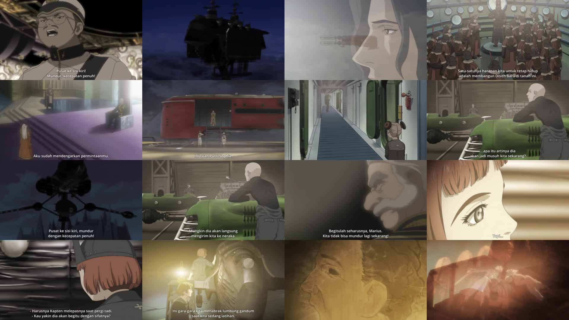 Nonton Anime Last Exile Episode 16 Subtitle Indonesia Gratis Full Movie yang menceritakan tentang Sophia meninggalkan Silvana untuk kembali ke ibu kota Anatoray. Ketika Jenderal Vitellius memberi tahu Kaisar bahwa Adipati Mad-thane telah menyerang armada Disith di Norkia, Perdana Menteri Marius memohon kepadanya untuk mengampuni Disith, yang baru saja kehilangan rumah mereka. Namun, Kaisar telah menghukum mati utusan Disith dan menempatkan Marius dalam tahanan rumah. Mullin mulai mempertanyakan mengapa ia tetap berada di Silvana, dan mengenang masa-masanya sebagai musketeer. Alex akhirnya mempertimbangkan untuk melancarkan serangan terhadap Persekutuan, dan Claus mengungkapkan kepada Lavie bahwa kapal mereka adalah milik Alex. Ketika Sophia tiba di ibu kota, ia juga memohon kepada Kaisar untuk mengesampingkan perbedaan dengan Disith dan menghadapi tantangan mereka bersama, tetapi Kaisar menolak dan memenjarakannya di menara. Sophia dikunjungi oleh Marius, yang membesarkannya setelah putrinya Euris meninggal di Grand Stream, dan diminta untuk tetap berada di menara sampai rencananya untuk menjadikan Sophia Permaisuri selesai. Malam itu, pasukan Disith melancarkan serangan mendadak ke ibu kota Anatoray, yang armada pertahanannya sudah menipis. Dalam kekacauan itu, Marius membunuh Kaisar tetapi juga terluka parah. Saat pasukan Disith memasuki ibu kota, Vincent menuju menara untuk mencegah pasukan Kaisar membunuh Sophia dan membawanya ke tempat aman di atas Urbanus, mengambil alih komando kapal kembali.