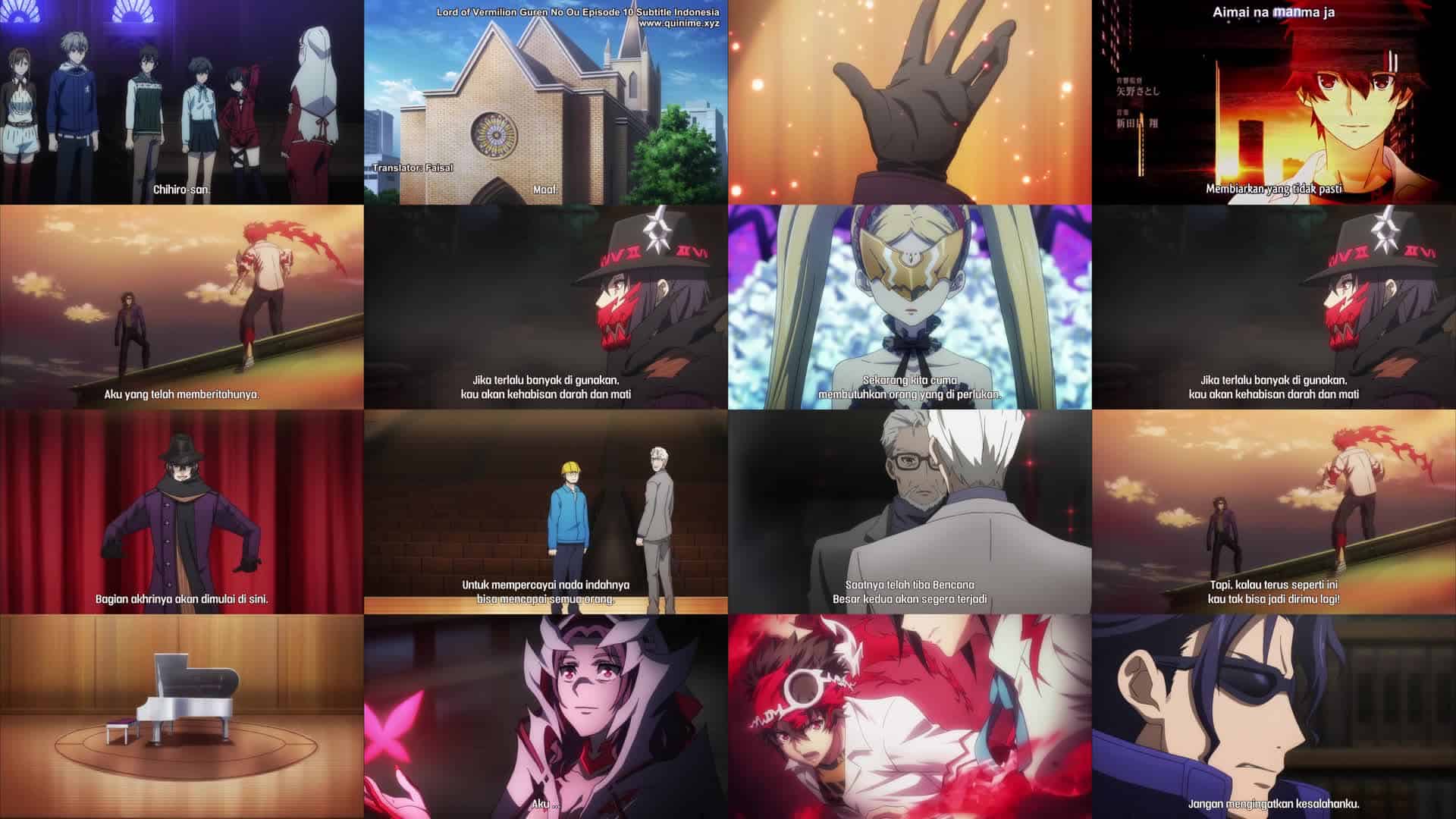 Nonton Anime Lord of Vermilion: Guren no Ou Episode 10 Subtitle Indonesia Gratis Full Movie yang menceritakan tentang Teater Infinity baru saja selesai dibangun, disponsori oleh AVAL. Pianis ternama Kark akan tampil di konser pembukaan, dan Grumman memberi tahu mandor konstruksi bahwa AVAL peduli untuk membuat orang bahagia dan tanpa biaya. Sebuah pintu jebakan raksasa dibangun di panggung, tempat batu kunci akan ditempatkan. Aliansi dibentuk kembali antara Gereja dan Negara, dengan tujuan baru untuk menghentikan rencana AVAL, tetapi hanya Akira dan Tsubaki yang bergabung. Dux setuju untuk bergabung dan menunjukkan kepada mereka enam batu kunci yang telah terpasang, yang telah menciptakan penghalang di sekitar satu sama lain agar mereka tidak dapat dilukai. Jika batu kunci ketujuh diaktifkan dan sistem selesai, Keruntuhan Besar Kedua akan terjadi, yang berarti kematian Garis Keturunan Heroik karena mereka kewalahan oleh jumlah familiar. Batu kunci terakhir ada di Teater Infinity. Grumman menyatakan ini akan menjadi pertarungan terakhir dengan Kark di garis depan dan Chiyu mendukung, karena dia adalah mahakaryanya, jauh lebih dari Yuri sebelumnya. Jun bertanya apakah ia meninggalkan Yuri dengan cara yang sama seperti ia meninggalkan subjek percobaan (Jun, Koume, dan Inuki), tetapi ayah Yuri memperingatkannya bahwa sebaiknya ia berguna jika ia tidak ingin dibesituakan dan menugaskannya untuk menjaga enam lokasi lainnya. Jun protes karena Chihiro pasti akan berada di lokasi ketujuh, tetapi itu karena ia tidak lagi mempercayai Jun untuk memprioritaskan melindungi batu kunci terakhir daripada membunuh Chihiro. Jun memberi tahu Yuri bahwa ia seharusnya membunuhnya dan Chihiro lebih awal dan Haru memberi tahu Yuri bahwa ini adalah kesalahannya dan memerintahkannya untuk memancing Chihiro keluar sehingga Jun dapat membunuhnya.