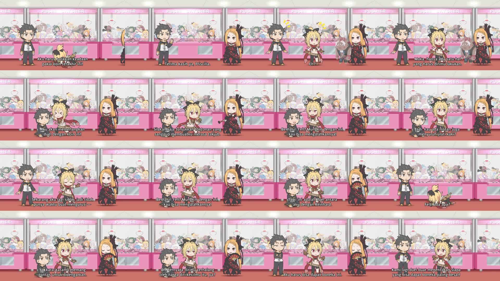 Nonton Anime Re:Petit kara Hajimeru Isekai Seikatsu Episode 6 Subtitle Indonesia Gratis Full Movie yang menceritakan tentang Sekali lagi Subaru bertemu Felt yang sedang mengambil koin di bawah mesin permainan capit, kali ini Priscilla masuk dan memergoki mereka. Felt berhasil mengambil koinnya kali ini dan hendak pergi untuk menantang Reinhard ketika Priscilla mengeluarkan boneka “Kakek Rom” dan menawarkannya kepada Felt dengan syarat dia harus membungkuk padanya. Felt menolak tawaran itu karena kontesnya adalah antara dirinya dan Reinhard dan akan salah jika mendapatkan hadiah dengan cara itu, lalu dia pergi untuk mengambil mainan.