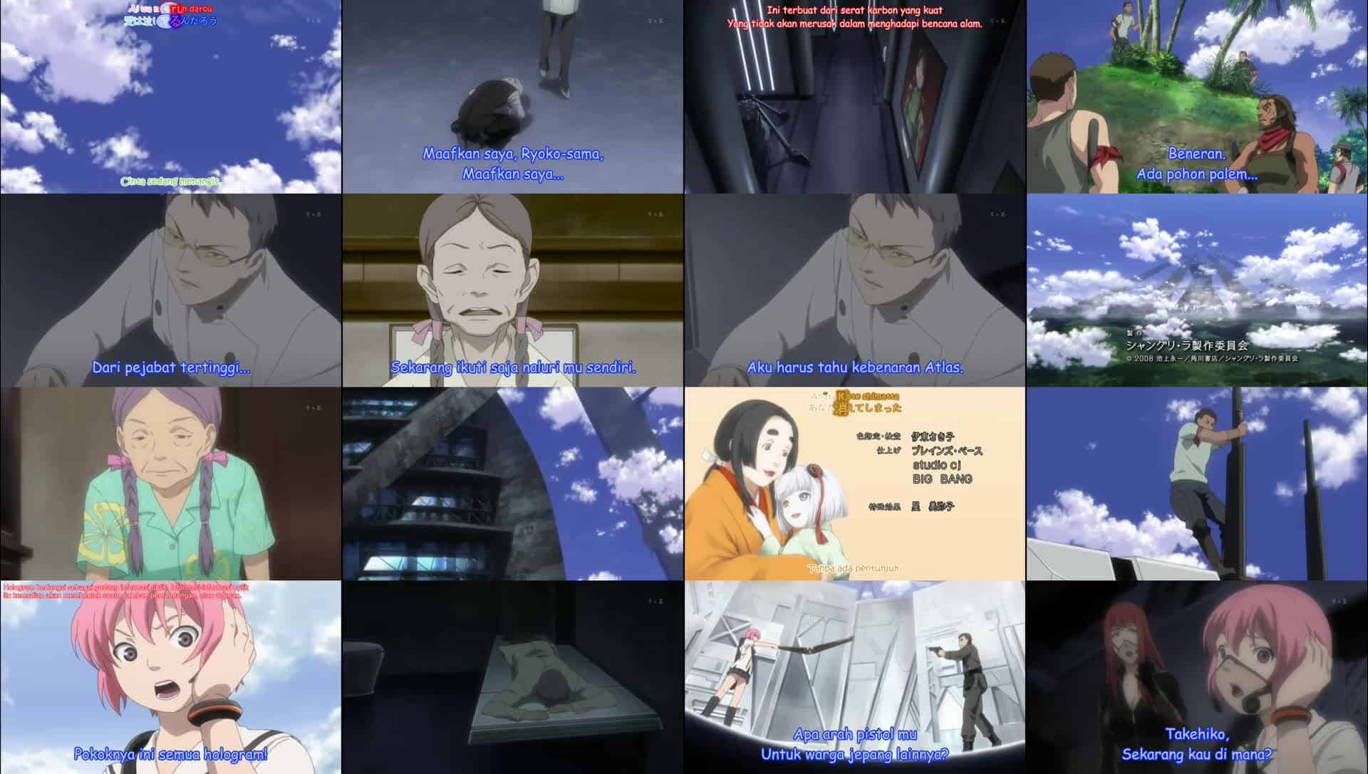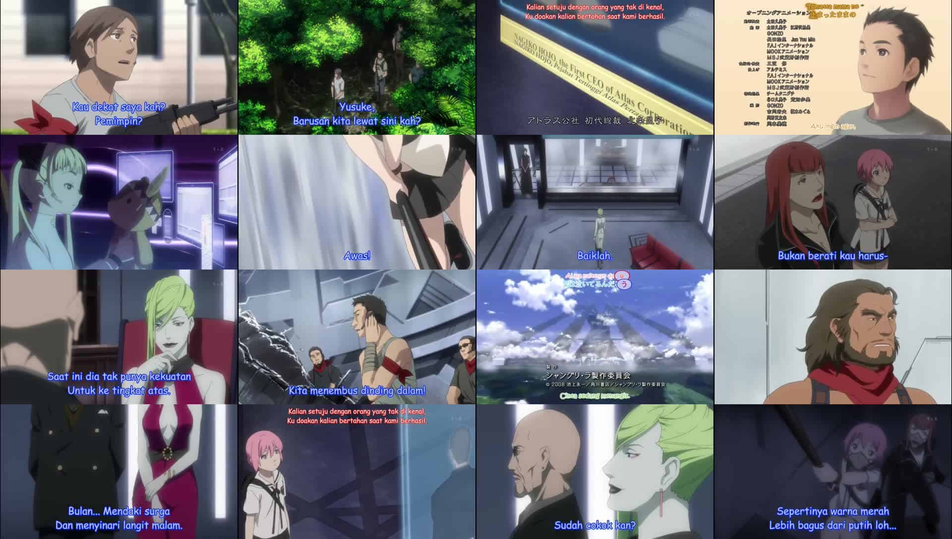 Nonton Anime Shangri-La Episode 14 Subtitle Indonesia Gratis Full Movie yang menceritakan tentang Banyak bagian Duomo diserang oleh kekuatan tembakan tak dikenal yang berasal dari Ikebukuro. Malam tiba dan Kuniko serta Momoko mencoba mencari jalan masuk. Meskipun pasukan Zaman Logam tersebar di sekitar, mereka berhasil menembus dinding bagian dalam kota. Namun, mereka segera terlempar ke lingkungan yang berbeda dan diserang oleh drone keamanan lapis baja tiruan. Kuniko menyadari bahwa semua lingkungan yang dilihat oleh pasukan Zaman Logam adalah hologram. Dia memerintahkan sisa pasukan Zaman Logam untuk berkumpul di Balai Kota. Saat Kuniko dan Momoko melewati hologram yang menggambarkan bangunan-bangunan bersejarah Tokyo, mereka membahas sejarah Proyek Atlas. Atlas diciptakan menggunakan dana yang disumbangkan oleh Sergei Talsian, setelah Jepang mengalami gempa bumi Kanto Besar Kedua yang menghancurkan Tokyo. Karin terus bermain di pasar saham meskipun Zhang memperingatkannya tentang individualitas Medusa. Talsian dan Ryoko menunggu penyelesaian Atlas agar digma Matahari, Bulan, dan Tanah dapat memenuhi takdir mereka. Sementara itu, Sayoko yang dipenjara terbangun dan mendapati pintu selnya terbuka lebar, lalu ia melarikan diri. Banyak pasukan Metal Age terbunuh oleh ilusi hologram. Kuniko menimbulkan kekacauan di seluruh wilayah, dan akhirnya bertemu kembali dengan Kunihito yang baru saja tiba di lokasi kejadian. Namun, sebelum mereka dapat berdebat lebih lanjut, mereka terpisah lagi. Kuniko berjalan melalui sebuah jalan dan akhirnya mencapai Gedung Parlemen. Pasukan Metal Age diracuni oleh gas yang dipancarkan dari serangan artileri yang menghantam Atlas. Kuniko memasuki gedung dan mendengar suara seorang wanita berbicara tentang pembentukan Atlas. Melalui foto-foto yang ditampilkan di gedung tersebut, Kuniko menemukan bahwa neneknya, Nagiko, adalah CEO pertama Atlas Corporation.