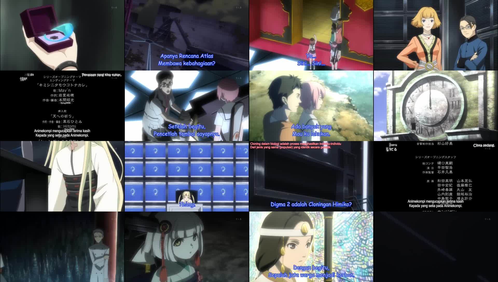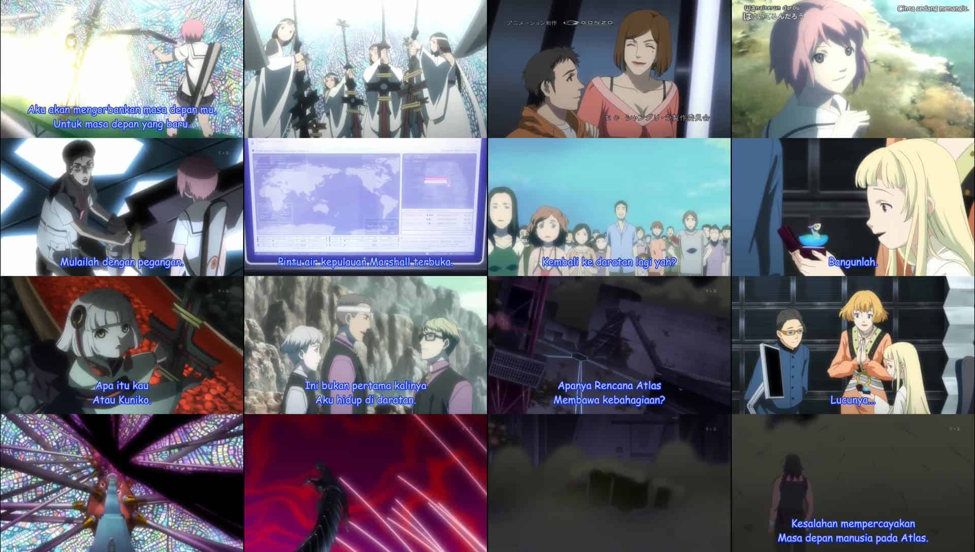 Nonton Anime Shangri-La Episode 24 Subtitle Indonesia Gratis Full Movie yang menceritakan tentang Kedatangan Kuniko menghentikan Mikuni untuk menarik tombak bertatahkan permata, dan Ryoko menyatakan betapa terkesannya dia karena Kuniko telah sampai sejauh ini. Dia menantang Kuniko untuk menarik tombak itu sendiri. Ketika Kuniko menolak, Ryoko menyandera Mikuni dan mengancam akan membunuhnya, memaksa Kuniko untuk menurut dan mengungkapkan bahwa Kuniko dan Mikuni sebenarnya bersaudara dan ibu kandung mereka sudah tidak hidup lagi, tetapi juga tidak sepenuhnya mati. Terungkap bahwa Kuniko dan Mikuni diciptakan secara artifisial dan Kuniko sebenarnya adalah klon Himiko, mumi dewi yang ditemukan di bawah Atlas. Ternyata tubuh Ryoko mulai melemah dan dia berniat untuk menyerang tubuh penerus baru. Di luar, sosok yang menyerupai Takehito mengungkapkan rasa jijiknya atas penggunaan nyawa manusia untuk membangun Atlas tepat sebelum meledakkan serangkaian bom kimia. MEDUSA telah mendapatkan kendali penuh atas sistem komputer. Kuniko terpaksa menghunus tombak dalam upaya menghentikan MEDUSA agar tidak memulai perang nuklir, tetapi ia terlambat, karena rudal nuklir diluncurkan ke seluruh dunia, melepaskan debu dalam jumlah yang tak tertandingi ke atmosfer yang sudah melemah. MEDUSA sendiri meramalkan musim dingin nuklir dengan penurunan permukaan air dan suhu di mana-mana dan akhirnya merasa tenang, yakin bahwa ia akhirnya aman. Tetapi rencananya gagal ketika ia membuka pintu air pulau-pulau, menganggapnya tidak berguna dan melepaskan gelombang pasang yang menghantamnya. Ternyata rudal yang diluncurkan adalah tipuan untuk menurunkan kewaspadaan MEDUSA dan membuka pintu air yang menahan air. MEDUSA tenggelam dalam air banjir yang naik dan Karin meratapi kematiannya dan orang tuanya. Marah karena rencananya gagal, Ryoko mencoba mengambil alih Kuniko, tetapi Kuniko mengejeknya dan terjadi pertempuran singkat, yang berakhir dengan Kuniko menusuk Ryoko dengan tombak. Ryoko tewas dan energi hidupnya diserap oleh Zeus yang mencoba menghidupkan kembali Himiko. Sayoko muncul di katakomba, terguncang tetapi tidak terluka. Kuniko dibawa pergi oleh tombak ke jantung Zeus di mana dia bertemu Himiko, duplikat dirinya sendiri. Himiko berencana menggunakan kesepuluh juta penduduk bumi untuk menghidupkan kembali dirinya. Kuniko dan Himiko saling berhadapan, bertarung untuk masa depan dunia. Bumerang Kuniko menebas jantung Zeus, mematikan sistem dan mengusir Himiko. Di katakomba, Miiko muncul di hadapan Mikuni dengan roh Hiruko dan semua anak yang dikorbankan. Miiko menyuruh Sayoko untuk menjaga Mikuni dan kemudian menghilangkan kekuatan terkutuk Mikuni, serta penyakitnya. Karin meratapi kehilangan uangnya, MEDUSA, dan orang tuanya, dan Klaris serta Zhang muncul untuk pertama kalinya, mengaku khawatir tentang teman mereka, Karin. Karin mengeluarkan mikrochip yang dulunya adalah MEDUSA dan tiba-tiba muncul sebagai versi miniatur dari program sebelumnya, yang diungkapkan Karin sebagai bayi MEDUSA. Ia dengan cepat mengenalinya sebagai ‘ibu’. Zhang mengatakan bahwa kali ini, mereka akan membesarkannya dengan benar. Atlas hancur dan Kuniko serta Kunihito menatap cakrawala. Kuniko menyatakan mimpinya untuk menciptakan Shangri La.