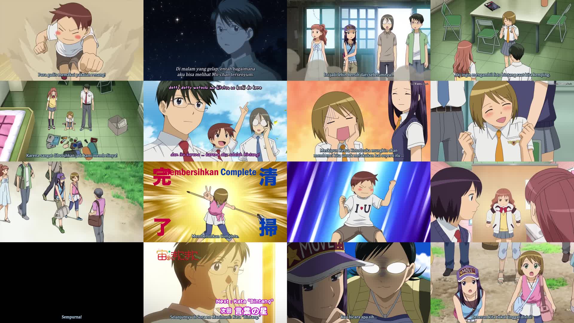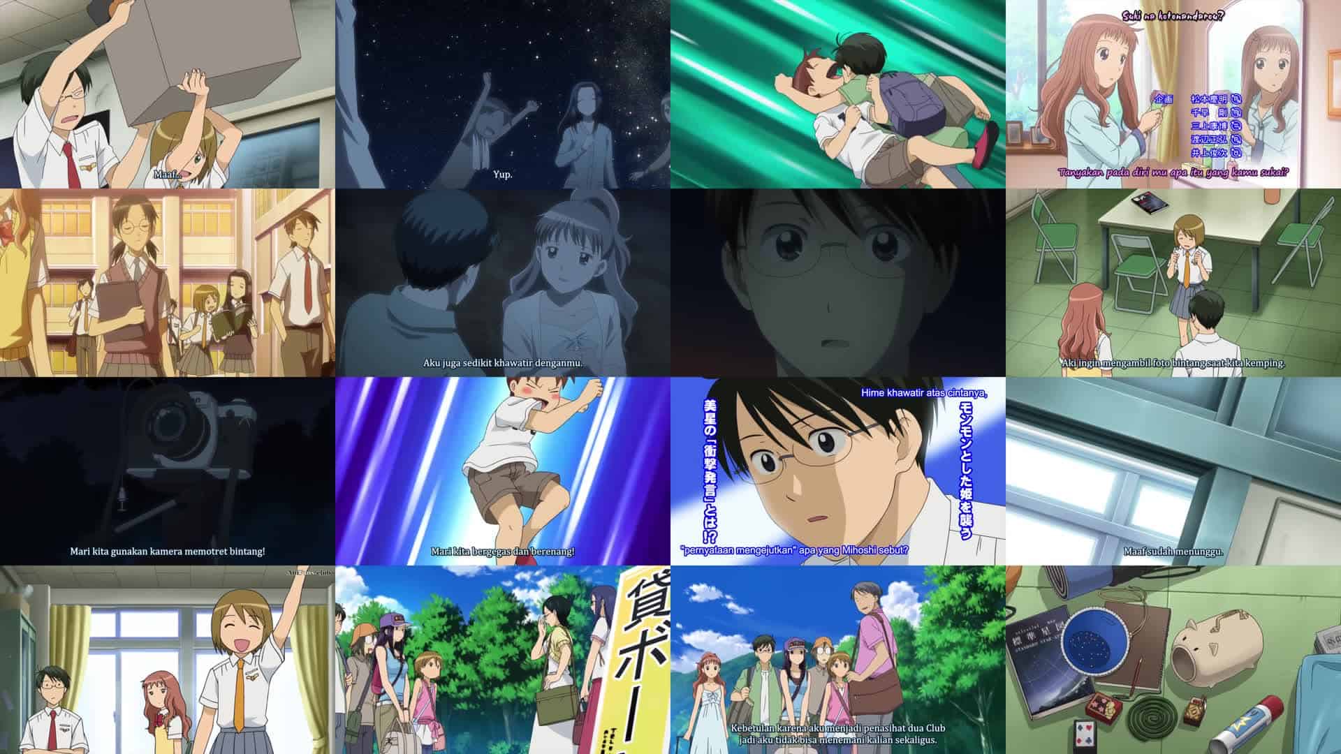 Nonton Anime Sora no Manimani Episode 4 Subtitle Indonesia Gratis Full Movie yang menceritakan tentang Ketua klub astronomi mengatur perkemahan pengamatan bintang, tetapi sebelum mereka pergi, Hime menjadi gelisah karena Mihoshi terus-menerus mendekati Saku, dan dia berteriak menanyakan apa pendapat Mihoshi tentang Saku. Mihoshi menjawab bahwa dia mencintai Saku, tetapi kemudian menambahkan bahwa dia juga mencintai semua orang. Setelah mereka tiba di dekat sebuah danau di Jepang utara, mereka menemukan bahwa klub sastra juga datang untuk berkemah, dan sementara mereka bisa menginap di gedung besar bergaya resor, anggota klub astronomi harus menginap di tempat yang kumuh. Mihoshi membersihkannya dan para anggota tidur siang agar bisa bangun di malam hari untuk mengamati bintang. Saku dan Hime masih khawatir tentang apa yang terjadi sebelumnya, tetapi mereka kemudian menyelesaikan masalah itu di antara mereka sendiri. Klub astronomi menghabiskan sepanjang malam mengamati bintang dan menyaksikan matahari terbit.
